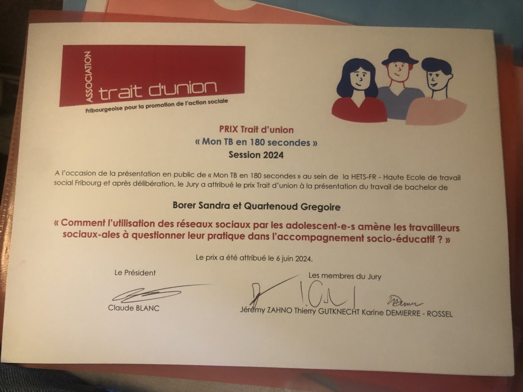 Le prix Trait d'union a été remis à Sandra Borer et Grégoire Quartenoud pour leur TB portant sur: Comment l’utilisation des réseaux sociaux par les adolescent·es amène les travailleur·euses sociaux·ales à questionner leur pratique dans l’accompagnement socio-éducatif ?
